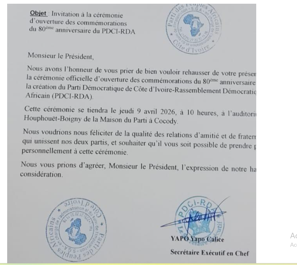 Mais qu’est ce qui a dû se passer pour que ce parti brille par son absence ? Pour l’heure, selon le courrier adressé par le Pdci rda à son frère Laurent Gbagbo, en date du 3 avril, ledit courrier est arrivé dans les mains du Secrétariat du Ppa-CI, le 8 avril 2026.